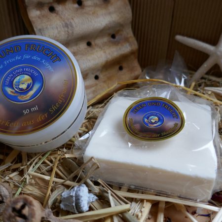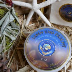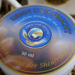 Aus der Serie „Leben und Frucht“ gibt es beim Lebe Gesund Versand noch die Ur-reine Sheabutter „Natur“, den Handbalsam mit 80 % Sheabutter-Anteil, einen Lippenbalsam mit 80 % Sheabutter, ein Shea-Gesichtspeeling und ein Shea-Körperpeeling sowie die Shea-Seife „Natur“ und die Shea-Seife „Lavendel“.