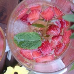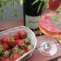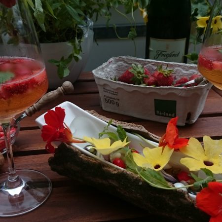 Frische Erdbeeren von Bioland (in unserem Fall frisch vom Wochenmarkt in Wilhelmshaven, der sogar einen Bioland-Stand hat) klein schneiden und mit etwas Eis in ein passendes Glas geben, frische Kräuter (z. B. Minze, Olivenkraut, Melisse oder Zitronenverbene) mit Bio Secco von Freixenet auffüllen , das Glas mit einer Erdbeere dekorieren, fertig. Schnell, einfach und köstlich.