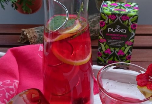 Vier Teebeutel der Geschmacksrichtung „wonderberry green“ in einer Karaffe mit 1 l kaltem Wasser aufgießen und über Nacht (oder für mindestens 8 Stunden) zum durchziehen in den Kühlschrank stellen.