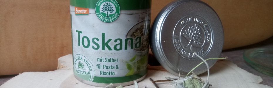 Bei der Gewürzmischung Toskana von Lebensbaum gibt der aromatische und leicht herbe Geschmack von Salbei dieser eine besondere Note. Weitere Zutaten sind nach Angaben des Herstellers Meersalz, Petersilie, Zwiebel, Paprika, Korianderblatt, Koriander, Anis, Ingwer, Zitronengras, Pfeffer und Piment, zum Teil aus kontrolliert biologischem bzw. aus biologisch-dynamischem Anbau (demeter).