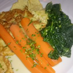 Das gleiche gilt für die beiden Hauptgerichte. Das Omelette mit Schnittlauch, sehr locker und leicht, die Möhren im Ganzen gebraten und serviert, die Kohlrabi und auch der Blattspinat geschmacklich sehr gut. Auch der Lachs in Zitronen-Riesling-Sauce auf Tagliatelle ebenfalls geschmacklich sehr gut.