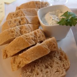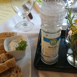 Zu unserem ersten Glas Wein (Pecorino Colli Pescaresi, Italien aus einer sehr alten Weinrebe namens Pecorino gekeltert) bekamen wir als Geschenk des Hauses einen Teller mit frischem Baguette und ein kleines Schälchen mit einer Kräuter-Creme. Das Baguette schmeckte knusprig und frisch und die Creme mit einem Hauch von Bärlauch ein Gedicht.