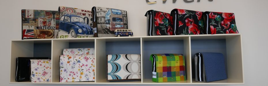 Große Taschen, kleine Taschen, Umhängetaschen mit unterschiedlichen Wechseldeckeln, Taschen mit den unterschiedlichsten Designs für Kinder, Männer und Frauen, Reisetaschen, stabile Tragetaschen, Fahrradtaschen, Rucksäcke u. v. m. Auch handgemachte Geldbeutel werden von der Inhaberin angeboten.